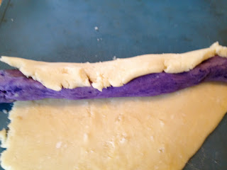 Roll out the 2nd color into a square the same length as your roll and then roll it around your first color.
