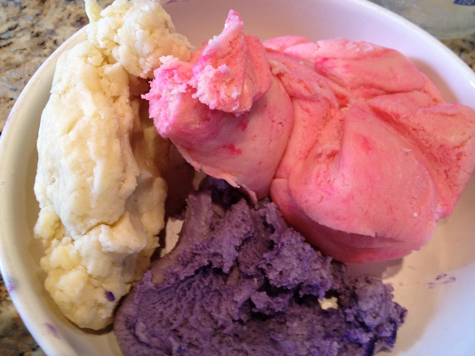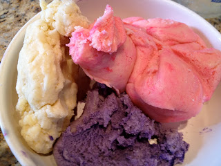 1. Divide the dough into 3 bowls. Color the dough with food coloring using 3 different colors. I kept one plain simply for contrast of the three colors.