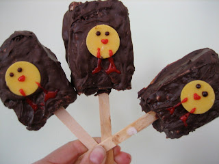I was shopping at Fresh Market the other day and briefly looked at the fun display of Easter treats they had towards the check out lines. I saw Chocolate Covered rice krispy treats on a stick.
