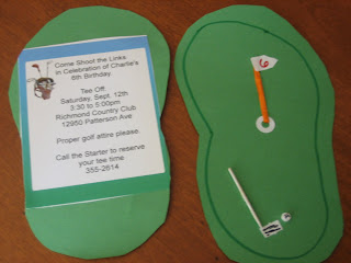 For the golf invitations, I simply used items I already had around the house, green construction paper, mailing labels, toothpicks, and markers.