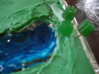 To make the golf course cake, before frosting the cake I cut out the water hazards and bunker areas then added a little layer of frosting inside the cave.