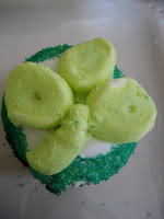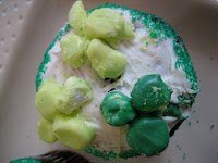 I remembered late this morning that I had a dozen cupcakes in my freezer with st. patrick’s day paper liners. I had to think of something besides just white or green frosting. I looked inside my pantry and found a jar of white frosting, marshmallows large and small, green sprinkles, green chocolate discs and green food dye.